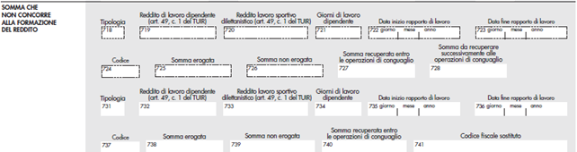 Si precisa che il punto 740 deve essere compilato nell’ipotesi di operazione straor­dinaria con passaggio di dipendenti senza interruzione del rapporto di lavoro e senza estinzione del precedente sostituto e nell’ipotesi di operazione straordinaria con estinzione del precedente sostituto d’imposta e con prose­cuzione dell’attività da parte del nuovo, nel caso in cui il primo sostituto abbia recuperato la somma erogata che non concorre alla formazione de reddito.