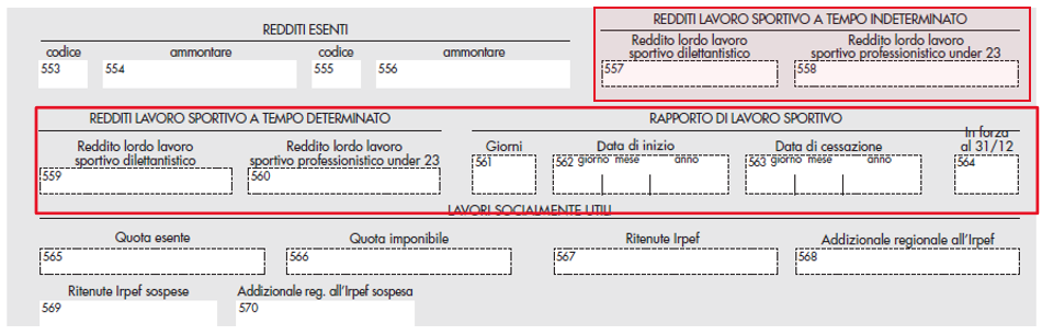 Quanto alla loro compilazione, nei punti da 557 a 560, vanno indicati i redditi di lavoro sportivo erogati da altri sostituti rispettivamente per il lavoro sportivo dilettantistico e per il lavoro sportivo professionistico under 23, relativamente a contratti di lavoro a tempo indeterminato e determinato.