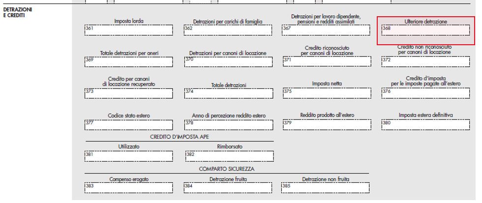 All’interno della sezione “detrazioni e crediti” della CU 2026, viene introdotta la casella 368 – “ulteriore detrazione”, in riferimento alla misura prevista dell’articolo 1, commi da 6 a 8 della Legge di Bilancio 2025.