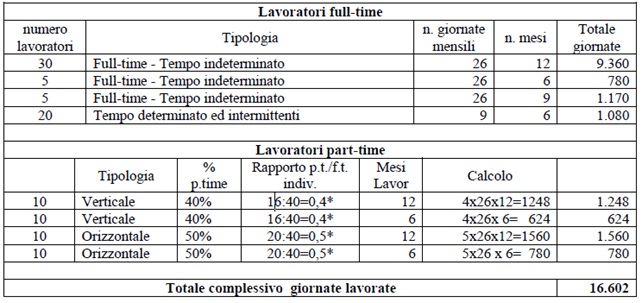 • 40 lavoratori a tempo parziale di cui 10 verticale che hanno lavorato tutto l’anno e 10 che hanno lavorato solo 6 mesi, entrambi con orario al 40% di quello normale e 20 con part-time orizzontale al 50% che hanno lavorato metà tutto l’anno e l’altra metà solo 6 mesi.