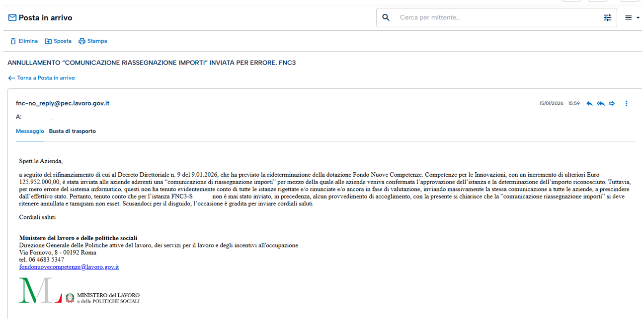Segue un esempio di comunicazione trasmessa dal Ministero del Lavoro e delle Politiche Sociali, che chiarisce l’errore nell’invio massivo delle pec con oggetto: ANNULLAMENTO COMUNICAZIONE RIASSEGNAZIONE IMPORTI INVIATA PER ERRORE
