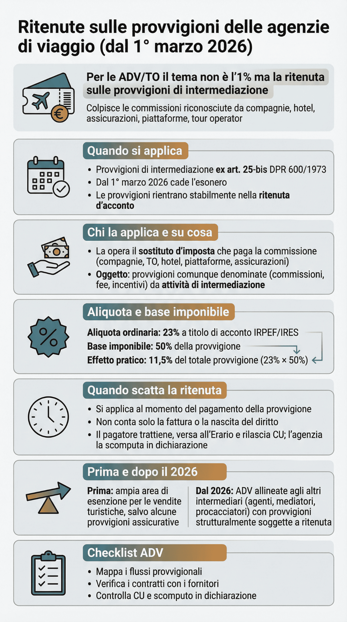 Regola ordinaria Per le provvigioni ex art. 25‑bis, D.P.R. n. 600/1973 (quindi anche per ADV/TO dal 1° maggio 2026), la regola base è: ritenuta 23% sul 50% della provvigione → 11,5% effettivo.