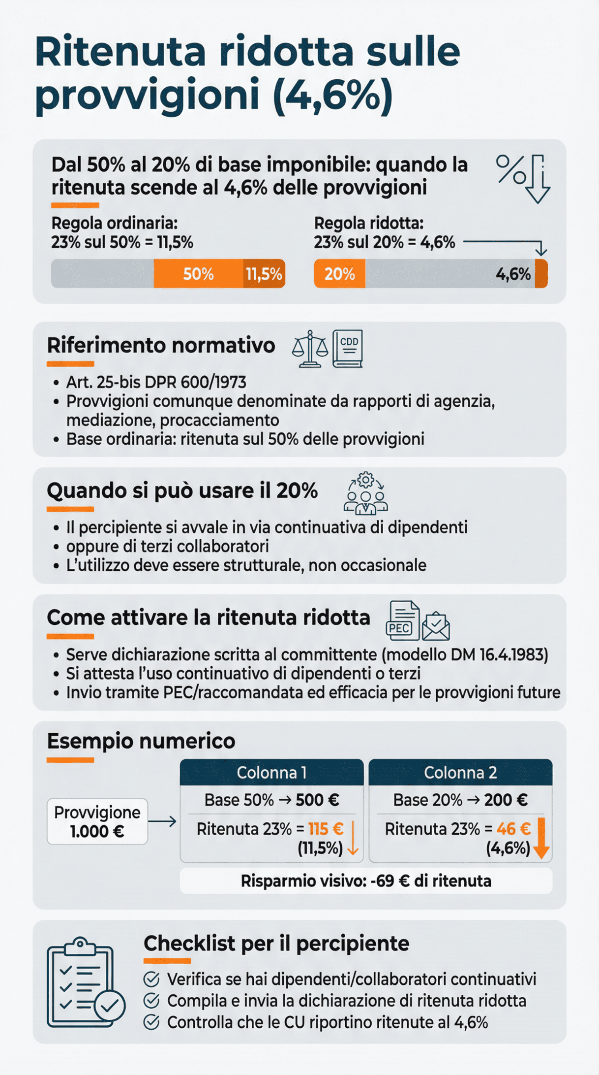 Base ridotta al 20% L’art. 25‑bis consente di ridurre la base imponibile al 20% delle provvigioni se il percipiente dichiara di avvalersi in via continuativa dell’opera di dipendenti o di terzi.