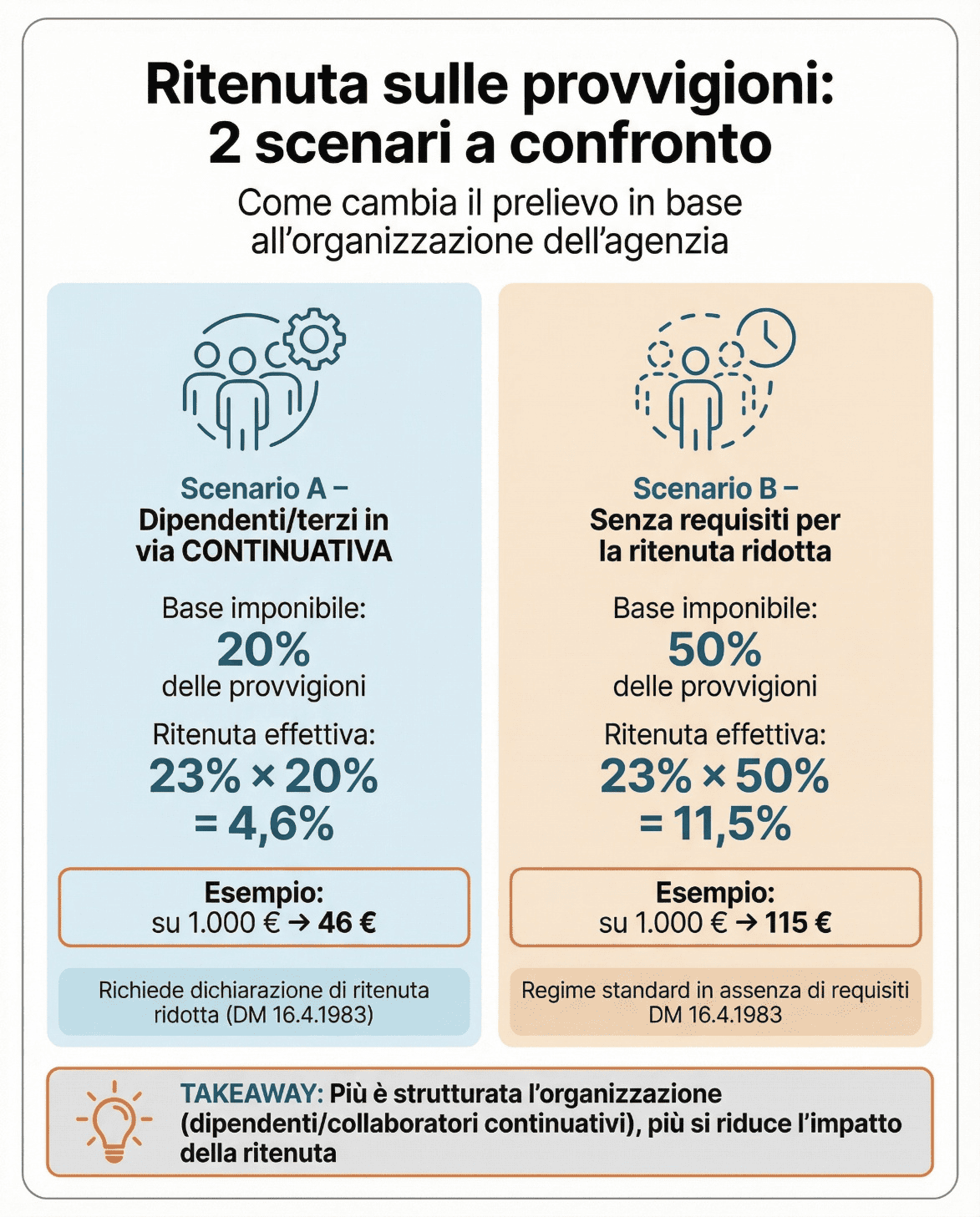 In molti casi è possibile avere la ritenuta calcolata solo sul 20% della provvigione (invece che sul 50%), con effetto pratico di un prelievo del 4,6% sul totale commissione.