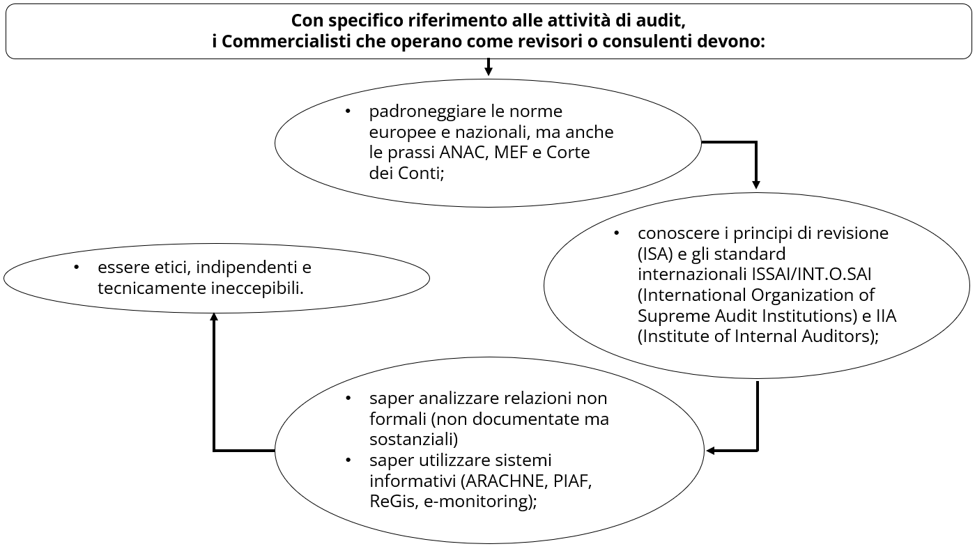 La specificità delle attività svolte nell’ambito della programmazione, gestione e controllo dei Programmi cofinanziati dai fondi SIE e dal PNRR, vede, con particolare riguardo all’area di prevenzione delle frodi e del conflitto di interesse, ambiti di operatività in cui la figura del commercialista, per conoscenze e competenze, è da ritenersi la più idonea ad affiancare e offrire supporto tecnico-specialistico alle Autorità coinvolte nell’attuazione degli obiettivi dell’Unione Europea su scala nazionale e regionale e ai beneficiari dei fondi nelle fasi di attuazione e realizzazione degli interventi.
