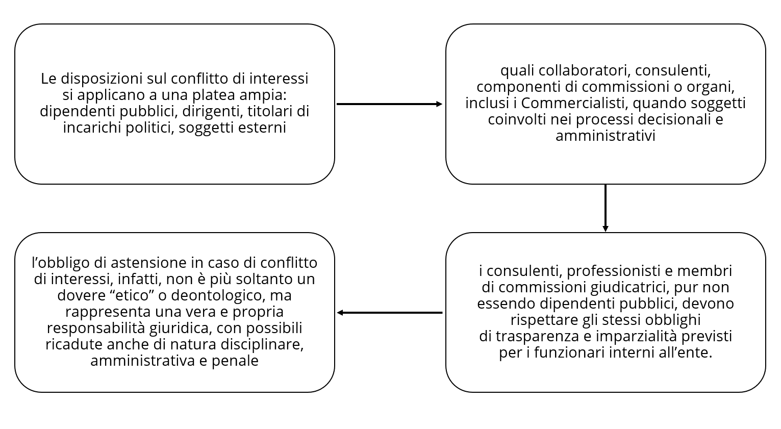 Nell’ambito della prevenzione del conflitto di interessi e, più in generale, della promozione dell’etica pubblica, osserva lo Studio dei Commercialisti, assumono un ruolo nodale gli strumenti di regolazione comportamentale. In tal senso, il Codice di comportamento, il Patto di integrità, il Codice di condotta e il Codice etico costituiscono riferimenti fondamentali nella costruzione di una cultura della legalità, della trasparenza e della responsabilità, tanto nelle amministrazioni pubbliche quanto nei soggetti privati destinatari a vario titolo di fondi pubblici.