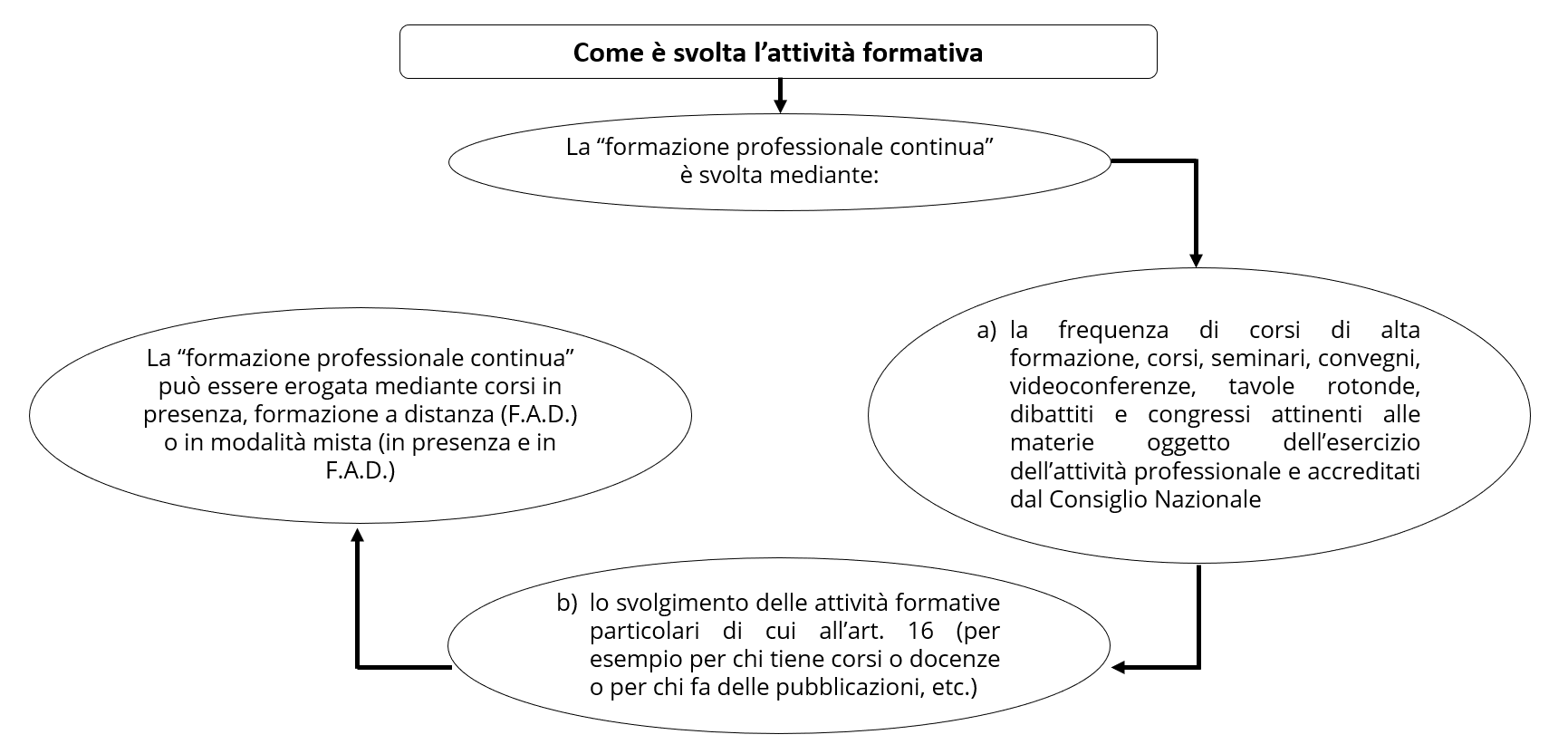 Per l’assolvimento dell’obbligo di formazione l’iscritto nell’Albo è tenuto ad acquisire in ciascun triennio formativo 90 crediti formativi professionali, mediante le attività formative indicate nel Regolamento. Almeno 9 crediti devono essere acquisiti mediante attività formative aventi ad oggetto l’ordinamento, la deontologia, le pari opportunità, l’organizzazione dello studio professionale e la normativa antiriciclaggio (c.d. CFP obbligatori).