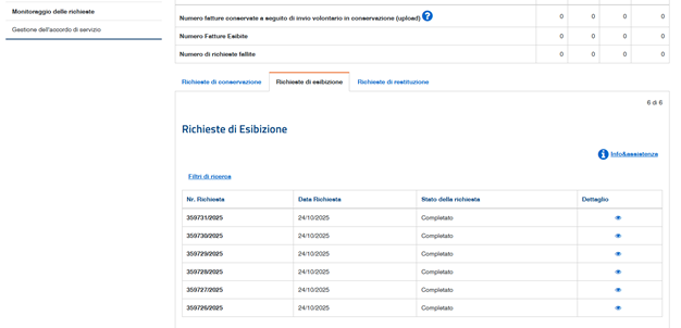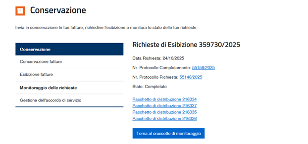 Per ciascuna richiesta originariamente inviata, vengono forniti documenti di accompagnamento (la richiesta avanzata e l’elenco delle fatture che, a seguito di tale richiesta, sono state estratte dall’archivio di conservazione).