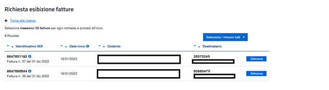 Una ulteriore limitazione da tenere in considerazione è il fatto che per ciascuna estrazione non possono essere richieste più di 50 fatture alla volta. Ciò significa che, una volta impostati i limiti, ci si vedrà proporre le fatture incluse nella richiesta, che potranno essere tutte selezionate se di numero inferiore alla soglia; in caso contrario, occorrerà ulteriormente “spezzare” la richiesta in periodi più brevi, al fine di contenere il numero dei documenti proposti.