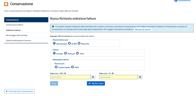 Il primo passaggio da effettuare è quello di procedere con la “richiesta di esibizione” dei files fattura a partire dall’archivio di Conservazione presente in piattaforma Fatture e Corrispettivi.
