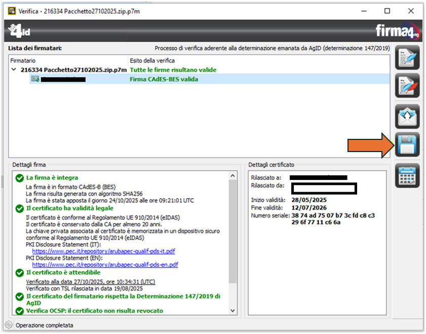 L’operazione descritta, quindi, dovrà essere ripetuta per ciascun pacchetto che il servizio di conservazione restituisce in esito alle richieste di estrazione avanzate.