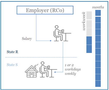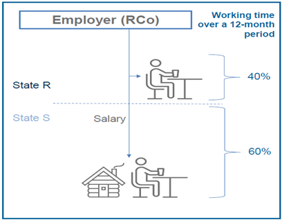 Un dipendente di RCo, un’impresa dello Stato R, lavora dalla propria abitazione situata nello Stato S per uno o due giorni alla settimana nell’arco di dodici mesi, per un totale pari al 30% del suo tempo di lavoro durante tale periodo.