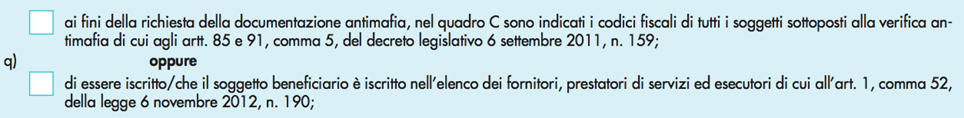 A tal fine, il soggetto beneficiario o il suo rappresentante firmatario, nella parte del modello “integrativo” relativo alla “Dichiarazione sostitutiva di atto notorio ai sensi dell’articolo 47 del d.P.R. n. 445/2000” era tenuto a rilasciare, barrando la relativa casella q), una delle seguenti dichiarazioni sostitutive:
