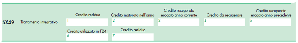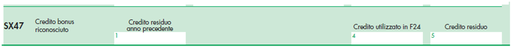 Nelle caselle “1 Credito residuo anno precedente” e “4 Credito utilizzato in F24”, indicando il credito residuo dell’anno precedente, come riportato anche nella casella 5 del rigo SX47, in caso di operazione societaria con estinzione del soggetto preesistente, gli importi devono essere comprensivi del credito residuo del soggetto estinto.