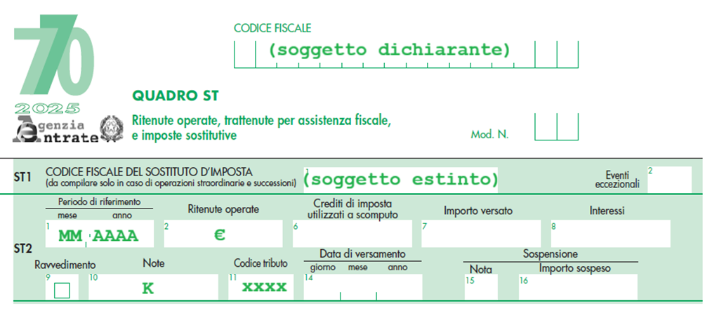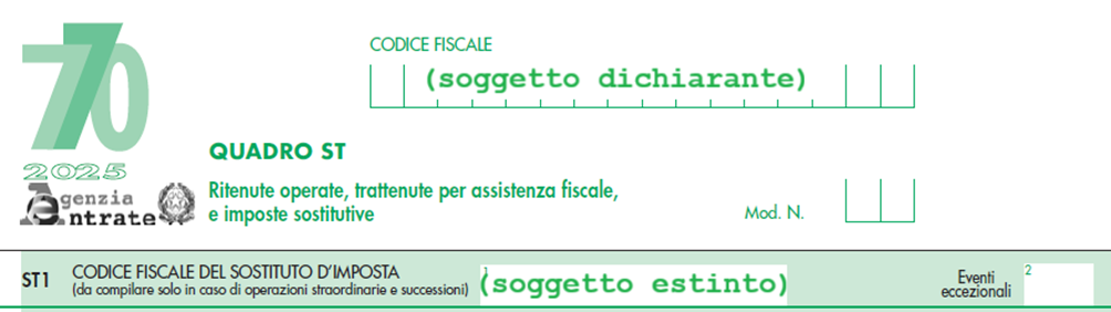 Altra situazione peculiare potrebbe essere l’ipotesi di ritenute operate dal soggetto estinto e successivamente versate dal soggetto subentrante. In tal caso la compilazione del Modello 770 prevede la predisposizione del quadro ST: