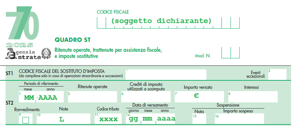 A decorrere dal Modello 770 2025, nel punto “Note” del quadro ST, è stato eliminato il codice “N”. In precedenza, veniva utilizzato nei casi di passaggio di dipendenti con prosecuzione del rapporto di lavoro, senza estinzione del precedente sostituto d’imposta. In tali situazioni, venivano riportate nello stesso rigo le residue rate di addizionale regionale all’IRPEF, il saldo e il primo acconto IRPEF, delle addizionali regionali, gli acconti a tassazione separata del secondo acconto IRPEF, del saldo, della prima e della seconda rata di acconto della cedolare secca (ove applicabile).