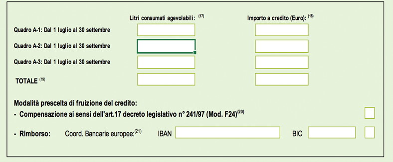 | Rimborso (Compensazione o restituzione in denaro) | Per la fruizione del rimborso dell’importo indicato i beneficiari sono tenuti a indicare nella dichiarazione presentata all’Ufficio delle Dogane se intendono utilizzare il rimborso mediante compensazione (F24, codice tributo 6740) o richiedere la restituzione in denaro, secondo le modalità stabilite con il Regolamento emanato con D.P.R. 9 giugno 2000, n. 277. | |