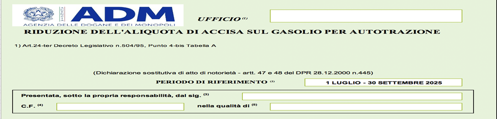 Sul sito Internet all’indirizzo www.adm.gov.it (Accise – Prodotti energetici – Benefici per il gasolio da autotrazione – Benefici gasolio autotrazione 3° trimestre 2025) è disponibile il software aggiornato per la compilazione e la stampa della dichiarazione per richiedere il rimborso.