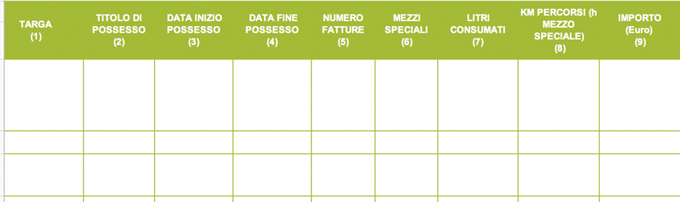 | Note operative comuni | Indicazioni valide per tutti i Quadri (A-1, A-2, A-3) | Data inizio possesso: 1° luglio 2025. Data fine possesso: 30 settembre 2025. Mezzi speciali: solo semirimorchi o rimorchi con attrezzature e serbatoi autonomi; non includere trattori/motrici. Litri consumati: indicare esclusivamente i litri riforniti nel periodo 1° luglio- 30 settembre 2025. Km percorsi (H mezzo speciale): riportare km effettivi o ore di funzionamento. Se necessario, ripartire tra i Quadri A-n sulla base di consumi specifici, serie storiche o rifornimenti. |