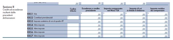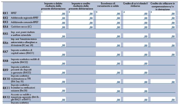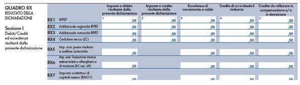 Il quadro RX deve essere compilato per l’indicazione delle imposte a debito o a credito, nonché per l’indicazione delle modalità di utilizzo dei crediti e/o delle eventuali eccedenze di versamento a saldo, Il quadro è composto dalle seguenti sezioni:
