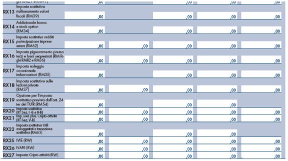 • rigo RX19 (opzione per l’imposta sostitutiva prevista dall’art.24-ter del TUIR – RM54): l’importo del rigo RM54 colonna 4;