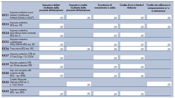 • rigo RX31 (Imposta sostitutiva dei soggetti che aderiscono al regime di vantaggio per l’imprenditoria giovanile e lavoratori in mobilità e contribuenti che fruiscono del regime forfetario): l’importo del rigo LM46;