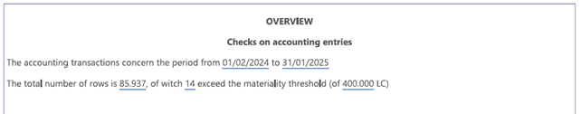Tramite programmi di “business intelligence” come Qlik o Power BI è possibile impostare report che riepilogano anche in dettaglio le operazioni oggetto di controllo: perché ad es. superiori alla materialità o perché rilevate in giorni festivi. In questo caso l’IA aiuta a prendere confidenza e creare procedure e formule utilizzabili serenamente per grandi quantità di operazioni e senza rischio di allucinazioni.