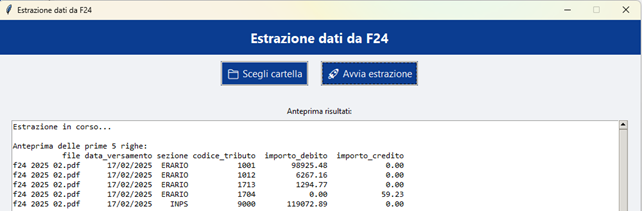 Allo stesso modo è possibile creare applicazioni direttamente tramite l’AI o facendosi guidare nello sviluppo di un programma Python per estrarre tutte le righe contenute in una cartella di lavoro con salvate le quietanze dei modelli F24.
